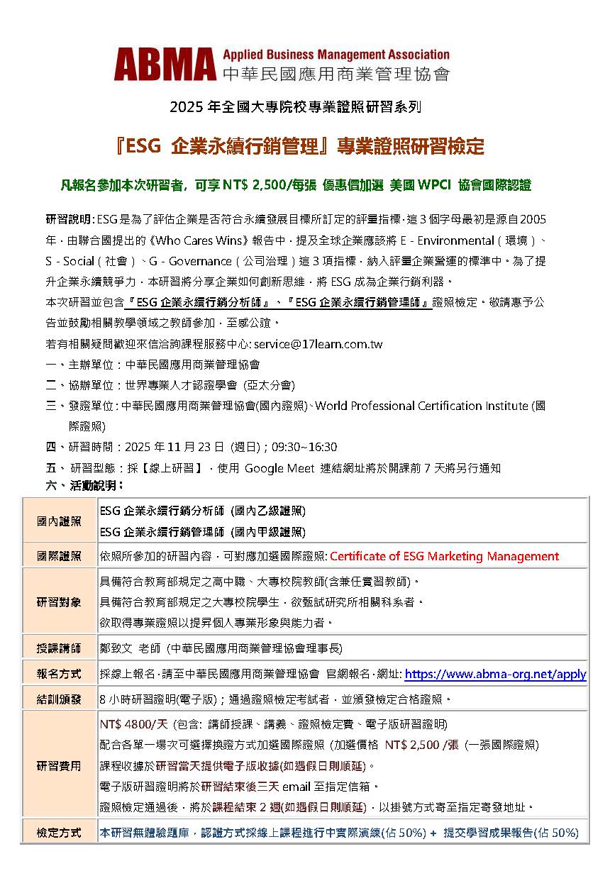 一、研習效益:本次研習並包含『ESG企業永續行銷分析師』、『ESG企業永續行銷管理師』雙證照檢定。