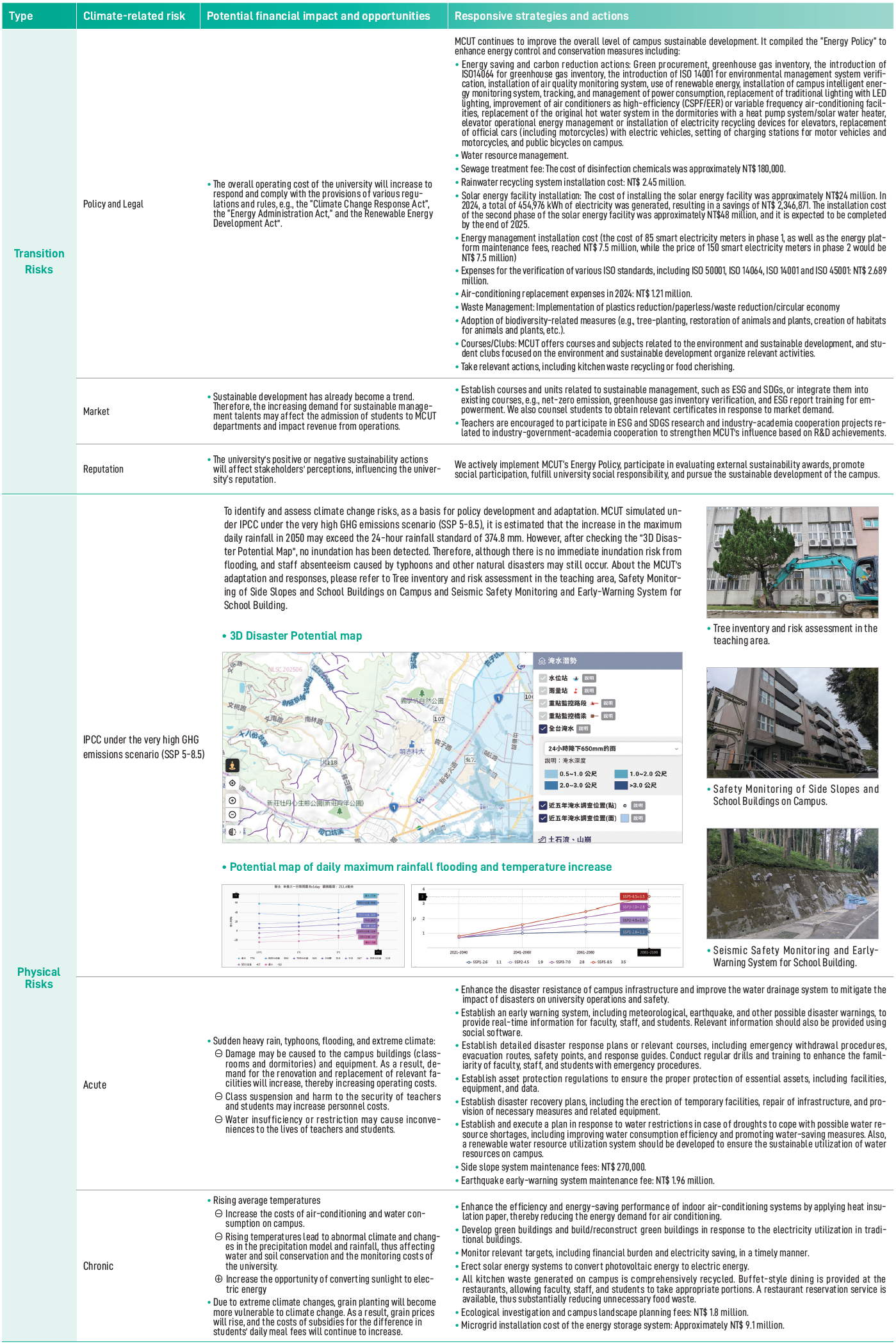 For MCUT, the risks of climate change may arise under the following circumstances: The transportation safety of teachers and students may be compromised during typhoons and heavy rains; water supply restrictions during droughts may impact water consumption on campus; air conditioners may need to be used for extended periods during hot weather; loose earth and stones from heavy rainfall may damage the campus; severe wind and rain may harm vulnerable fixtures; and extreme temperatures can lead to increased water and power consumption. These risks will lead to higher renovation and maintenance costs at MCUT and may result in personal injuries during extreme weather conditions. Furthermore, climate change not only affects the financial aspects of MCUT but also has implications for personal safety.